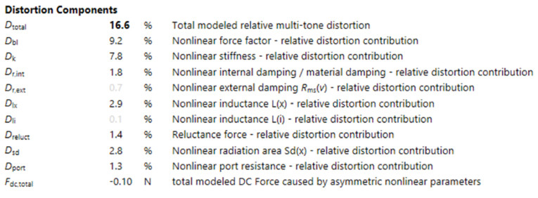 The total DC force resulting from all the nonlinearities combined is also calculated and provides insight into asymmetries in the loudspeaker’s parameters. If the resulting force becomes too high, it may be necessary to increase the mechanical stiffness of the suspension or to reduce asymmetries in other parameters.
