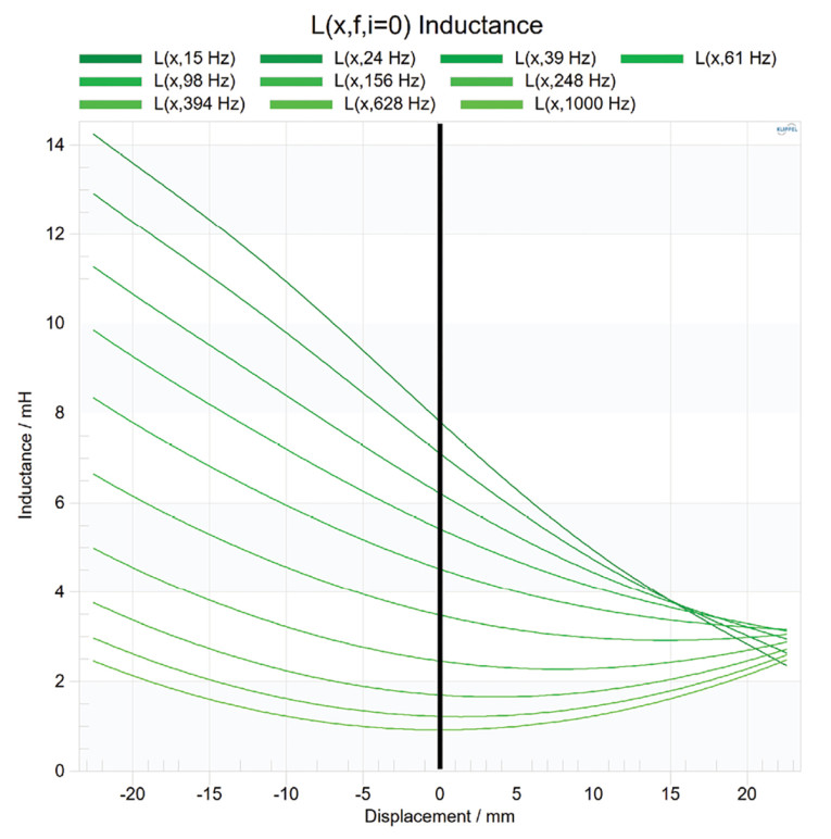 The previous LSI algorithm identified a single nonlinear inductance curve, which represented the effective inductance over the entire excited bandwidth. However, this approximation becomes inaccurate when shorting material is present in the transducer motor and when the transducer operates over a wide frequency range. To address this, the nonlinear inductance model in FLSI was extended to a frequency-dependent nonlinear inductance, L(f, x, i). In Figure 6, the shape of the nonlinear inductance curve highly depends on the frequency.