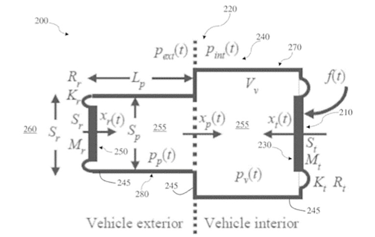In the second patent under review, Takashi Kinoshita and Ben John Feng of Bose Corp. disclose a fully “passive” noise cancellation system based solution. The background and summary of the invention as presented is: Some recently advanced systems use a transducer with a vented duct venting the rear wave outside of the vehicle to control low-frequency sound. However, these ducted transducers can introduce an additional challenge, namely the introduction of exterior noise into the vehicle cabin via the duct.